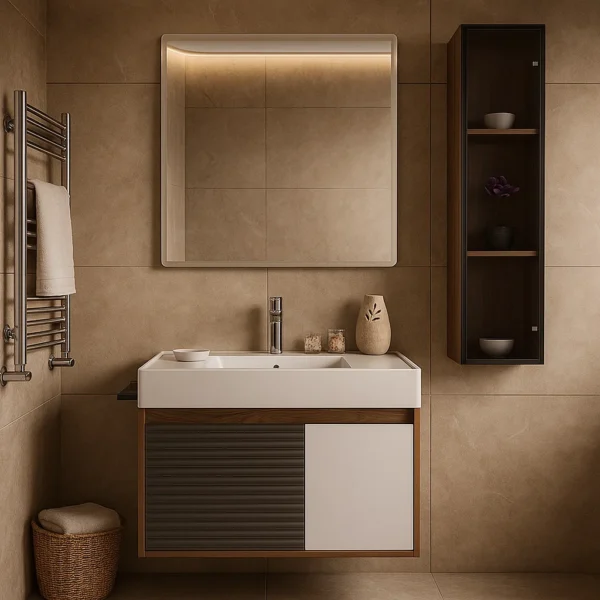 Ansorja e integruar ofron hapësirë të shkëlqyer për vendosjen e produkteve të përditshme, duke mbajtur banjon të rregullt dhe estetike.