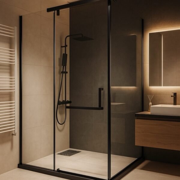 Kabina ka hapje me derë dhe kornizë të zezë, që i shton një pamje moderne dhe të sofistikuar çdo banjoje.