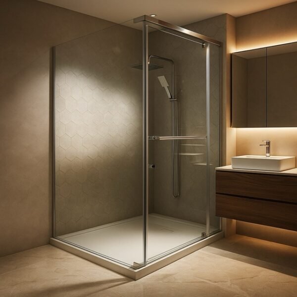 Kabina ka hapje me derë dhe kornizë silver, duke siguruar një kombinim perfekt të funksionalitetit dhe elegancës.