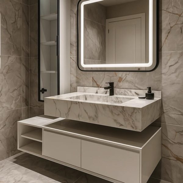 HD006 DOLLAP – Set Banjo 120 cm me Sipërfaqe Pllake, Strukturë Plastike & Pasqyrë LED me Ansore