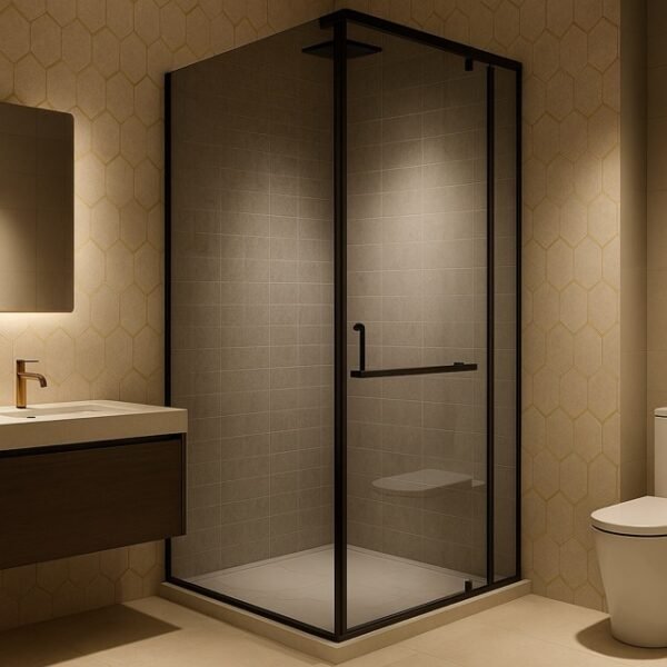 Kabina ka hapje me derë dhe kornizë të zezë, duke i dhënë banjës një pamje moderne dhe të sofistikuar.