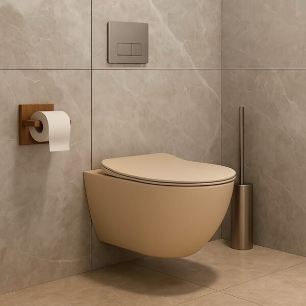 Ngjyra krem mate dhe materiali antibakterial e bëjnë këtë WC të përshtatshëm për banjo moderne në Kosovë, duke përfshirë qytetet kryesore si Prishtinë, Ferizaj, Gjilan, Pejë dhe Prizren.